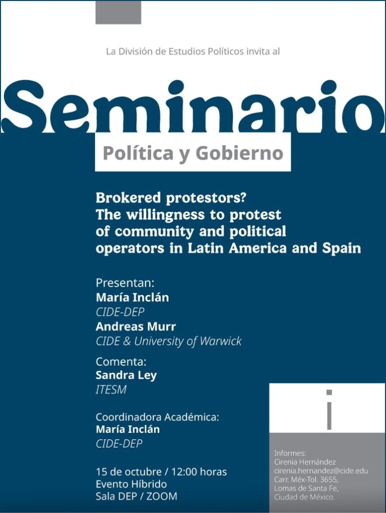 La @depCIDE invitó a la sesión del Seminario Política y Gobierno titulada “Brokered protestors? The willingness to protest of community and political operators in Latin America and Spain”.