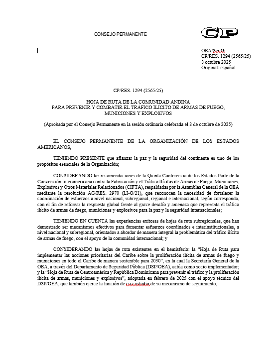 El Consejo Permanente de la Organización de los Estados Americanos (OEA) aprobó la resolución titulada “Hoja de Ruta de la Comunidad Andina para prevenir y combatir el tráfico ilícito de armas de fuego, municiones y explosivos”.