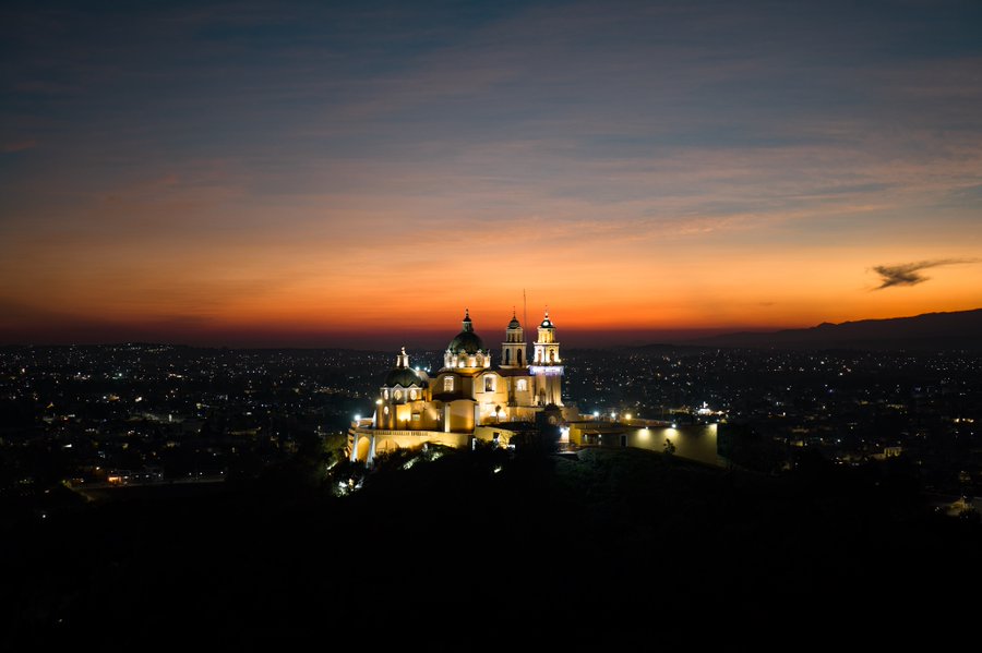 Cholula, Pueblo Mágico fundado en el periodo preclásico en el año 500 A.C ubicado a 7 km de Puebla de los Ángeles. Cholula recibe flanqueado por con el volcán Popocatépetl e Iztaccíhuatl de 5465 metros de altura. En el centro la pirámide dedicada al dios de la lluvia Tláloc o Chiconahui Quiahuitl con una base de 450 metros por lado. La pirámide más grande del mundo.