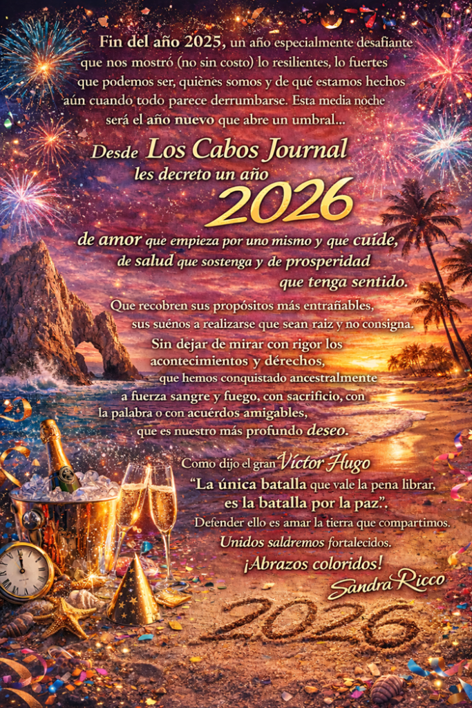 Esta media noche será el año nuevo que abre un umbral… Desde Los Cabos Journal les decreto un año 2026 de amor que empieza por uno mismo y que cuide, de salud que sostenga y de prosperidad que tenga sentido. Que recobren sus propósitos más entrañables, sus sueños a realizarse que sean raíz y no consigna.