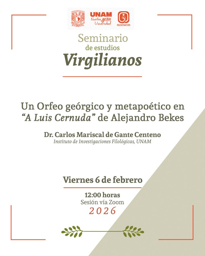 Recuerda que mañana el doctor Carlos Mariscal de Gante Centeno impartirá la sesión Un Orfeo geórgico y metapoético en «A Luis Cernuda» de Alejandro Bekes