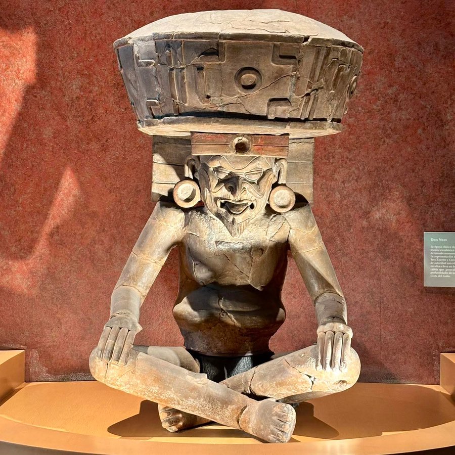 En la Costa del Golfo durante el periodo Clásico, las sociedades alcanzaron una expresividad escultórica singular al crear figuras de barro a gran escala únicas, como las de Tres Zapotes y Cerro de las Mesas. Esta pieza representa la figura de Huehuetéotl, el “Dios Viejo del Fuego”, uno de los personajes más antiguos del panteón mesoamericano. El culto al fuego, entendido como principio vital y fuerza renovadora, fue una idea ampliamente compartida en diversas regiones y periodos.