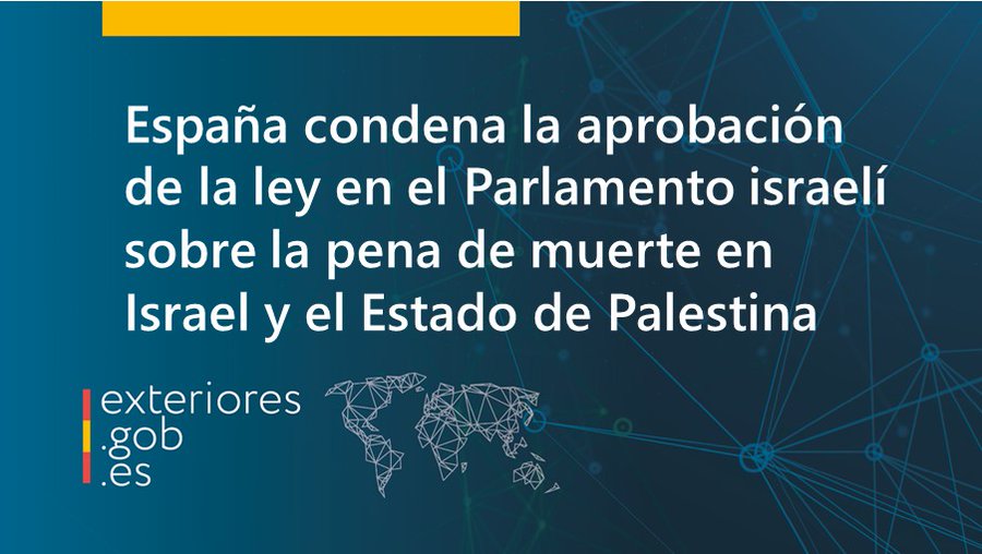 El Ministerio de Asuntos Exteriores, Unión Europea y Cooperación expresó la condena de España ante la aprobación en el Parlamento israelí de una ley sobre la pena de muerte en Israel y en el territorio ocupado del Estado de Palestina. A través de un mensaje oficial, la dependencia fijó su postura sobre una medida que considera de alta gravedad y la acompañó con un enlace a su comunicación institucional. Con ello, el gobierno español reiteró públicamente su posición frente a esta decisión legislativa. Ver más