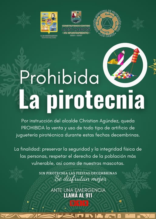 El presidente municipal de Los Cabos, Christian Agúndez Gómez, anunció durante la ceremonia cívica de este lunes que la venta de pirotecnia al menudeo quedará prohibida en el municipio durante las festividades navideñas y de fin de año. La medida tiene como propósito proteger a sectores vulnerables y prevenir incidentes que pongan en riesgo a la población.