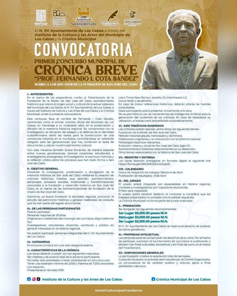 El Ayuntamiento de Los Cabos lanzó la convocatoria del Primer Concurso Municipal de Crónica Breve “Prof. Fernando I. Cota Sández”, como parte de las actividades rumbo a los 300 años de la fundación de la cabecera municipal.