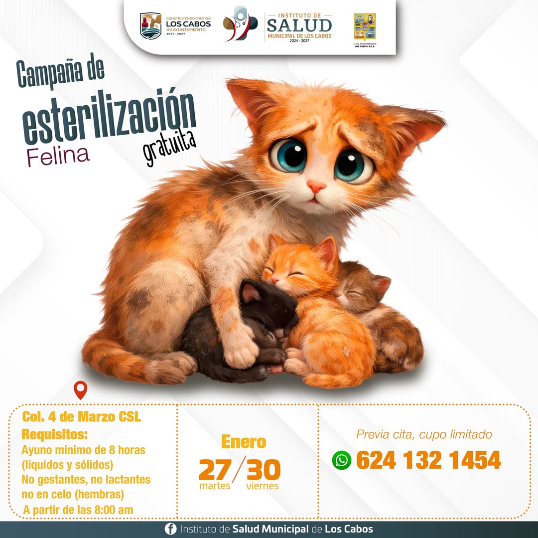 Con el objetivo de promover el bienestar animal, prevenir la sobrepoblación felina y fortalecer la salud pública, el Instituto de Salud Municipal de Los Cabos convocó a la ciudadanía a participar en la Campaña de Esterilización Felina que se realizará este martes 27 y viernes 30 de enero en la colonia 4 de Marzo, en Cabo San Lucas.
