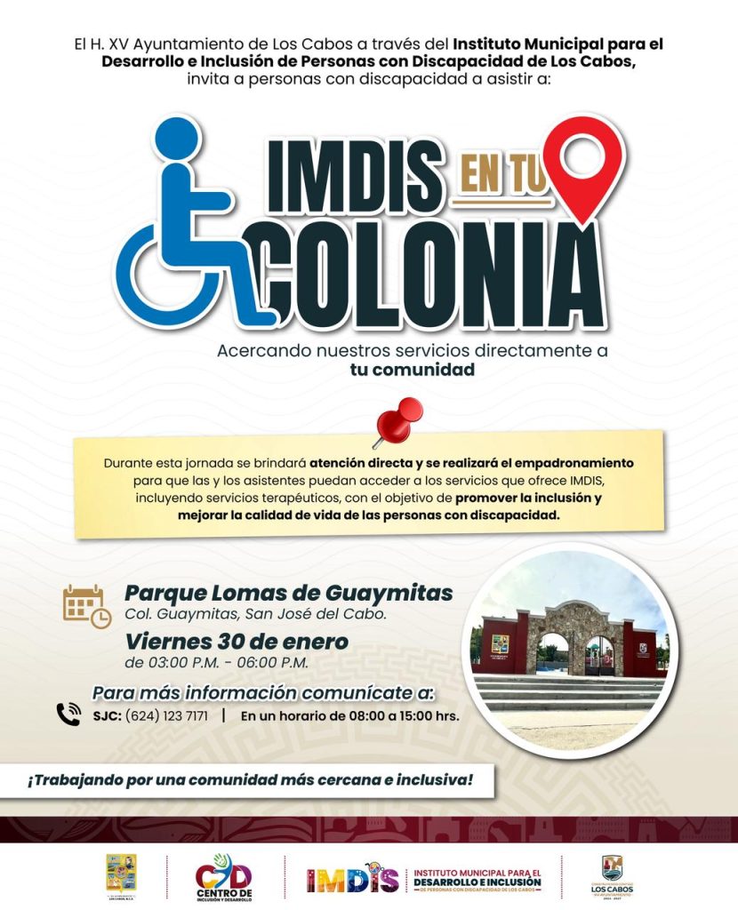 Autoridades municipales de Los Cabos pusieron en marcha el programa IMDIS en tu Colonia, a través del Instituto Municipal para el Desarrollo e Inclusión de Personas con Discapacidad, con el objetivo de acercar servicios de salud, terapias, talleres e integración a personas con discapacidad motriz en distintas zonas del municipio.
