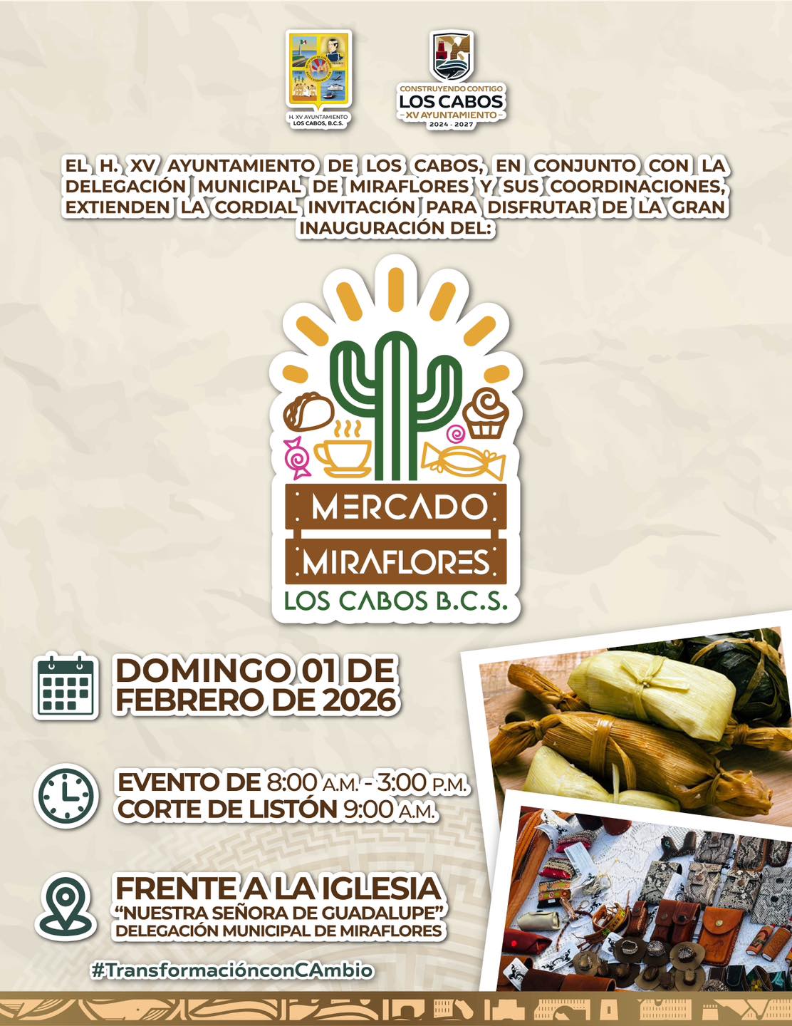 Autoridades municipales de Los Cabos, en coordinación con la Delegación Municipal de Miraflores y la Coordinación de Fomento Económico, invitaron a la ciudadanía y a visitantes a la inauguración del Mercado Miraflores, un espacio creado para impulsar la economía local y visibilizar la actividad productiva de la zona rural del municipio.