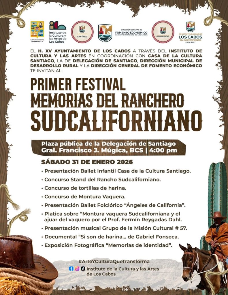 Autoridades municipales de Los Cabos, a través del Instituto de la Cultura y las Artes y en coordinación con la Delegación de Santiago, la Dirección General de Fomento Económico y la Dirección Municipal de Desarrollo Rural, realizarán este sábado 31 de enero el primer festival “Memorias del Ranchero Sudcaliforniano”.