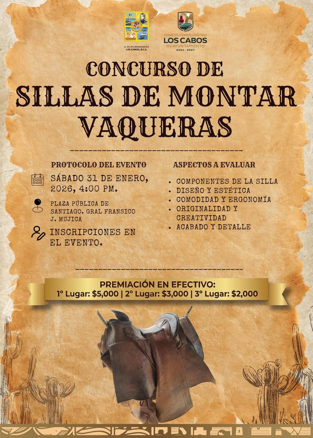 Con el objetivo de preservar y fortalecer las tradiciones del municipio, autoridades de Los Cabos, a través de la Dirección Municipal de Desarrollo Rural, invitaron a la ciudadanía a participar en el Concurso de Sillas de Montar Vaqueras, que se realizará como parte del Primer Festival “Memorias del Ranchero Sudcaliforniano”.