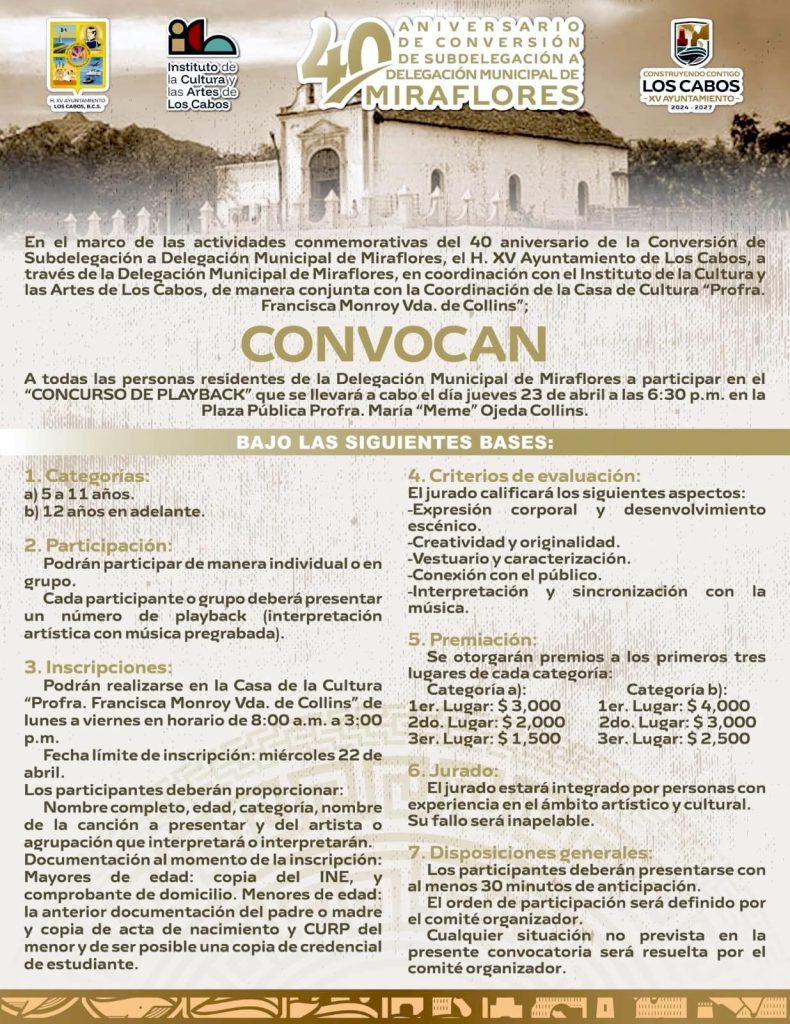 Ayuntamiento de Los Cabos invita a celebrar el 40º aniversario de Miraflores como delegación