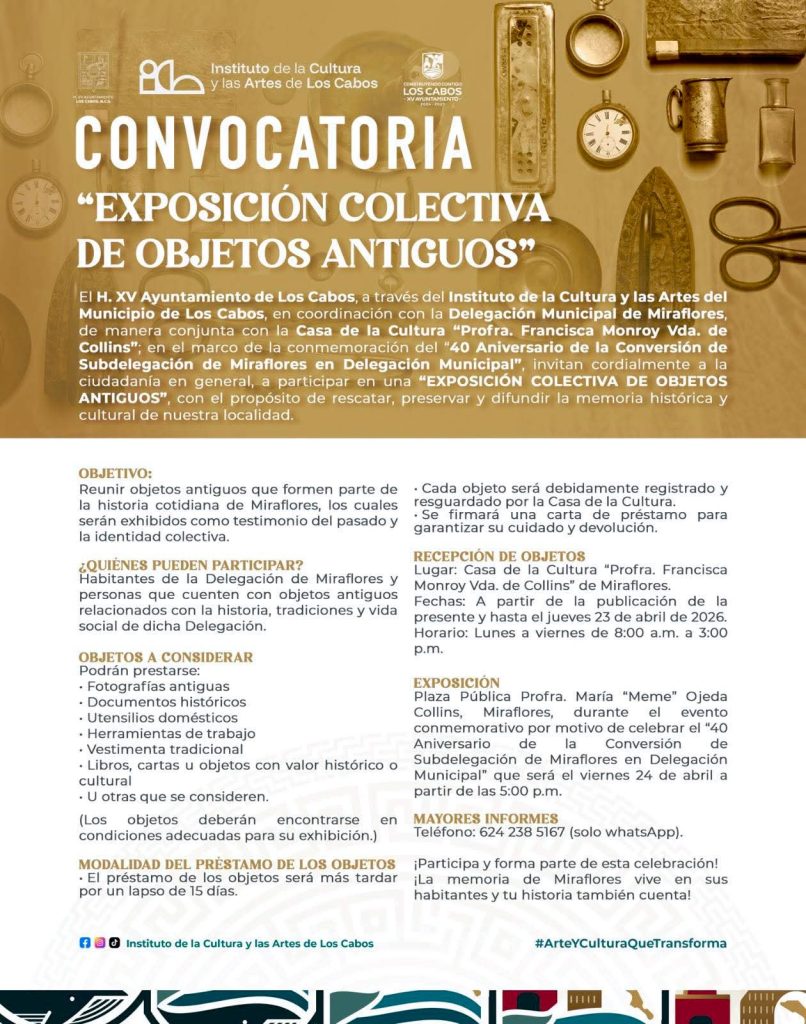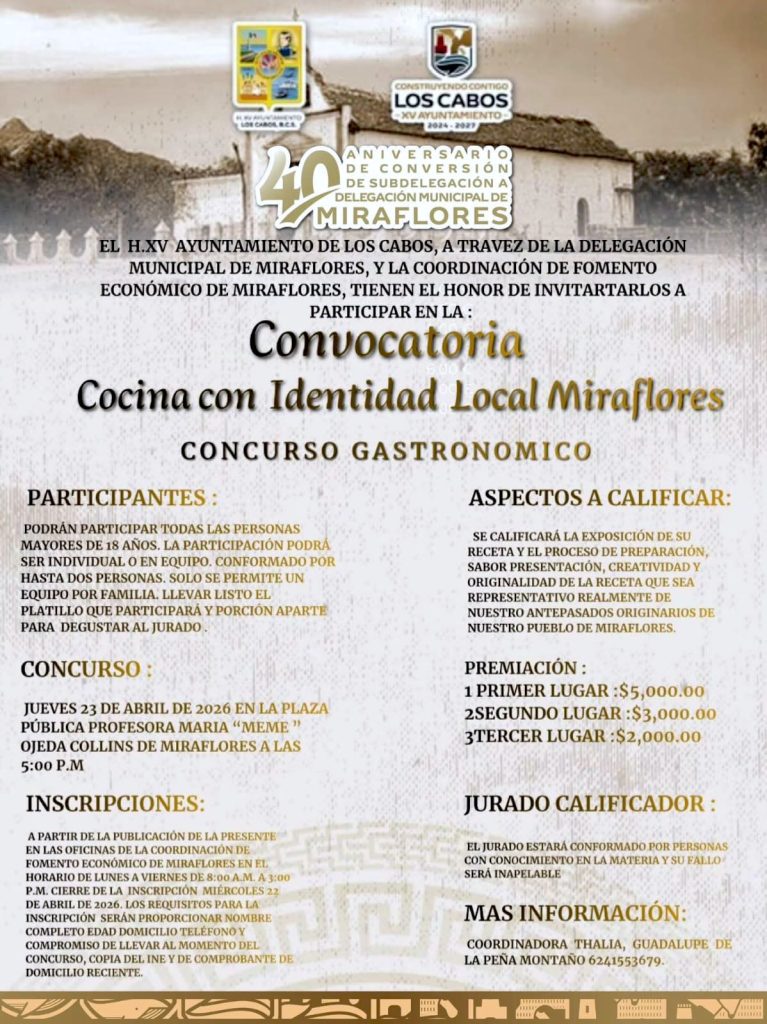 El Ayuntamiento de Los Cabos invitó a la ciudadanía a sumarse a la conmemoración por el 40º aniversario de la conversión de Miraflores a delegación municipal, con un programa de actividades culturales y cívicas abierto a familias, residentes y visitantes.