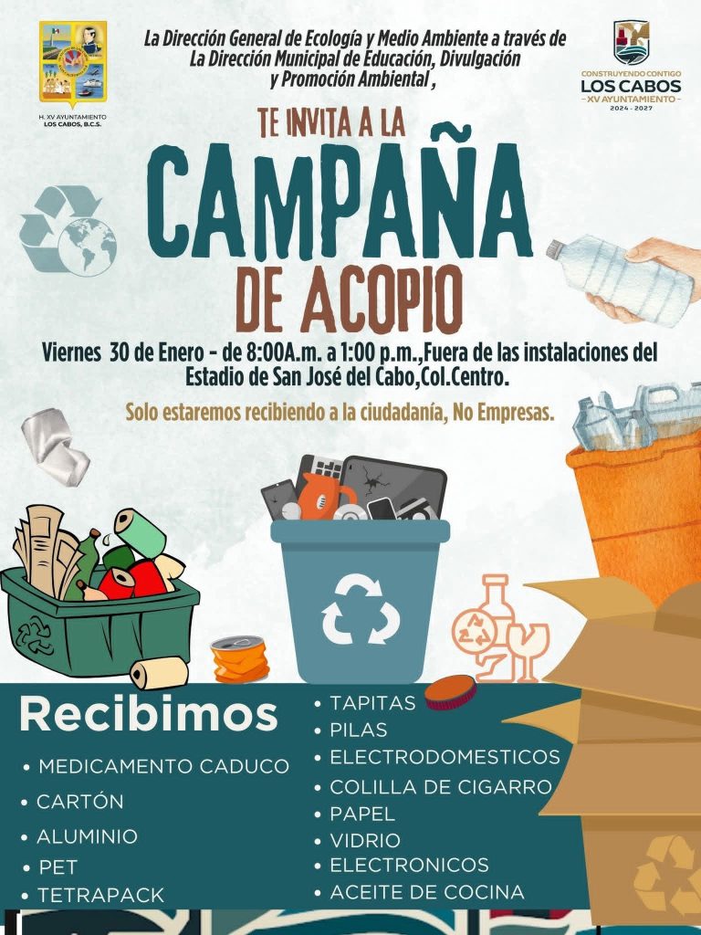 El gobierno de Los Cabos, a través de la Dirección General de Ecología y Medio Ambiente, convocó a la ciudadanía a participar en la primera campaña de acopio de materiales reciclables del año 2026, como parte de las acciones orientadas al cuidado del entorno y la promoción de prácticas sustentables.