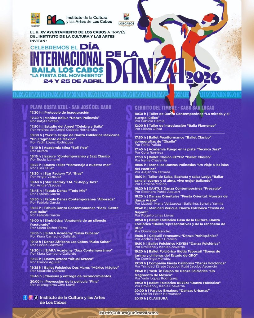 El Ayuntamiento de Los Cabos, a través del Instituto de la Cultura y las Artes, anunció el evento gratuito “Baila Los Cabos: La Fiesta en Movimiento”, con el propósito de promover la convivencia, fortalecer el acceso a la cultura y reconocer a la danza como una expresión que une a la comunidad.