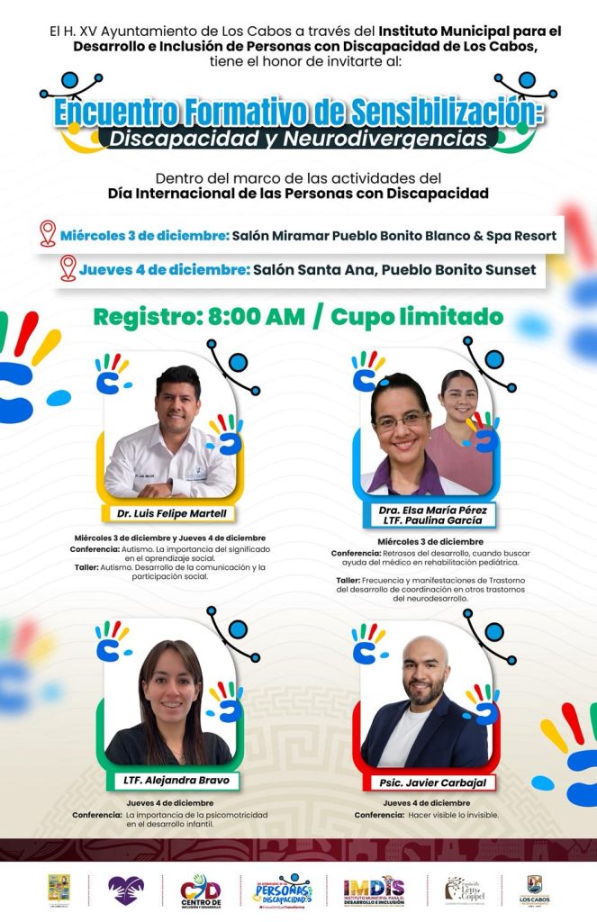 En el marco del Día Internacional de las Personas con Discapacidad, el Ayuntamiento de Los Cabos, a través del Instituto Municipal para el Desarrollo e Inclusión de Personas con Discapacidad, anunció la realización del Encuentro Formativo de Sensibilización: Discapacidad y Neurodivergencias, dirigido a familias, docentes, profesionales y ciudadanía interesada en temas de inclusión.
