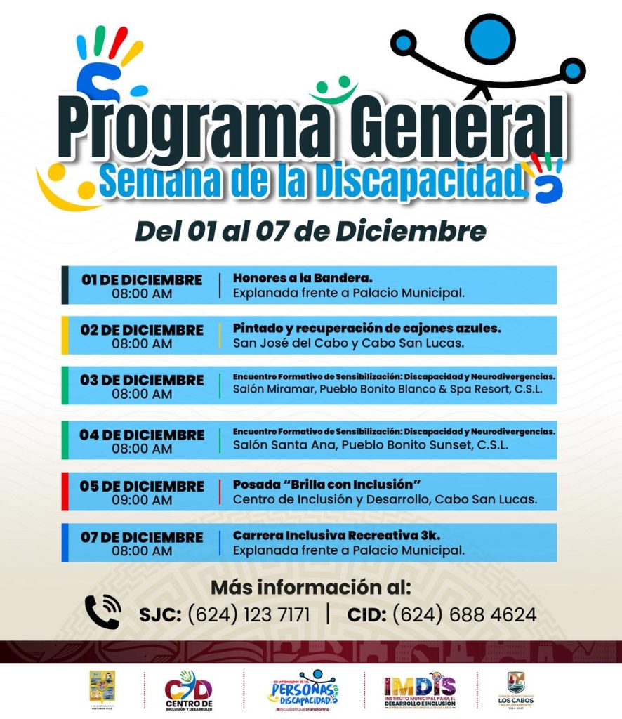 El Ayuntamiento de Los Cabos, a través del Instituto Municipal para el Desarrollo e Inclusión de Personas con Discapacidad, dio a conocer el programa oficial de la Semana de la Discapacidad 2025, que se llevará a cabo del 01 al 07 de diciembre con actividades de sensibilización, formación e integración comunitaria.
