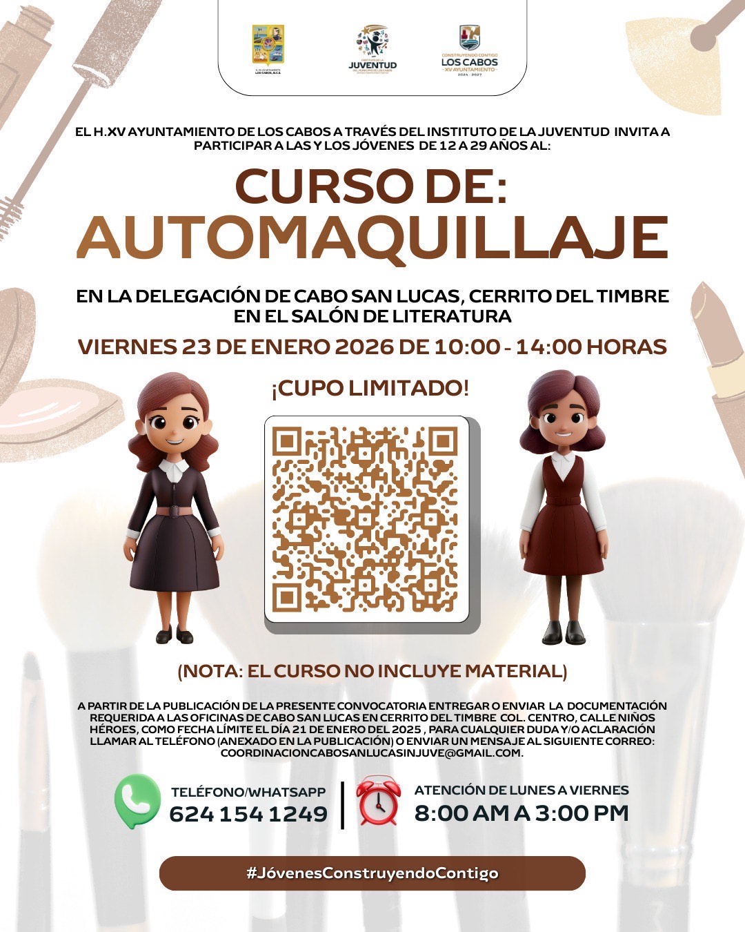 El gobierno de Los Cabos, a través del Instituto de la Juventud, lanzó la convocatoria para participar en el Curso Intensivo de Automaquillaje de Día, dirigido a jóvenes de entre 12 y 29 años de edad, con el objetivo de brindar conocimientos básicos sobre técnicas de imagen personal.