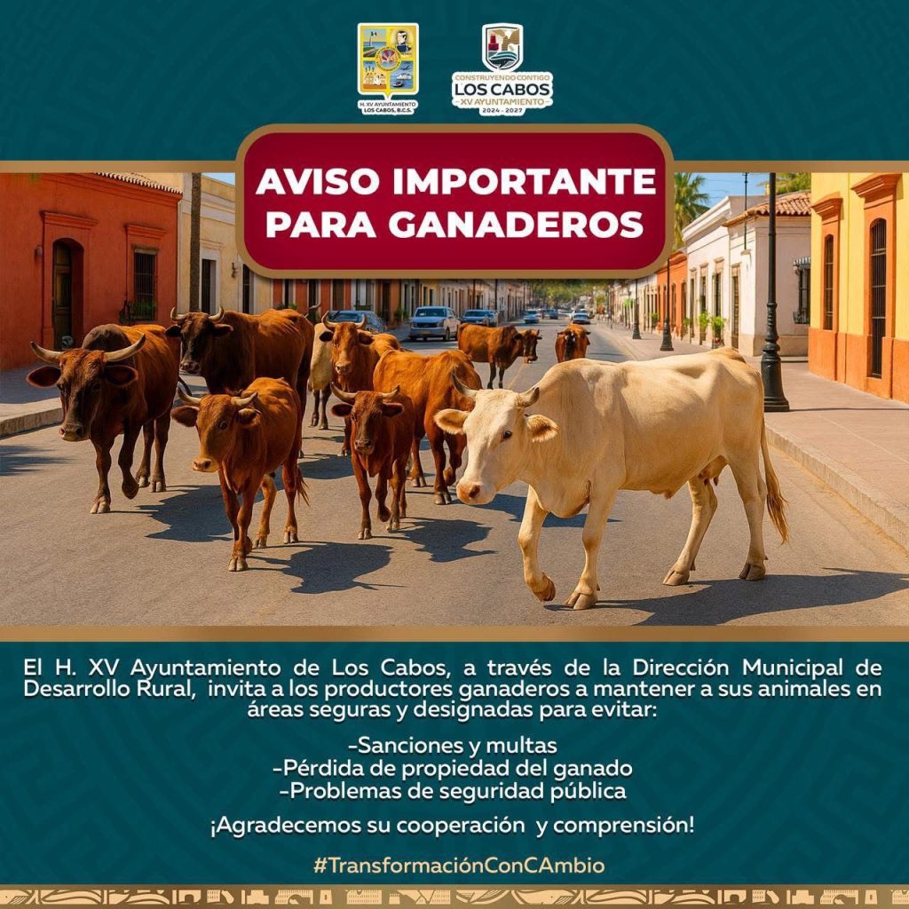 Con el objetivo de fortalecer el ordenamiento territorial y reducir riesgos para la población, el Ayuntamiento de Los Cabos, a través de la Dirección Municipal de Desarrollo Rural, reiteró el llamado a productoras y productores ganaderos para mantener a sus animales dentro de áreas seguras y debidamente designadas. La medida busca evitar sanciones, pérdidas económicas y situaciones que comprometan la seguridad en zonas urbanas.
