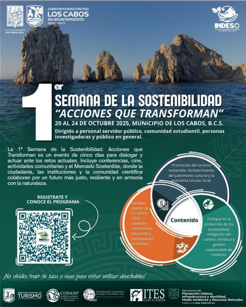 Con el objetivo de fortalecer la cultura cívica, la cohesión comunitaria y la participación ciudadana, el Ayuntamiento de Los Cabos, a través del Instituto de Desarrollo Sostenible (Indeso), anunció la primera “Semana de la Sostenibilidad: Acciones que Transforman”, que se llevará a cabo del 20 al 24 de octubre.