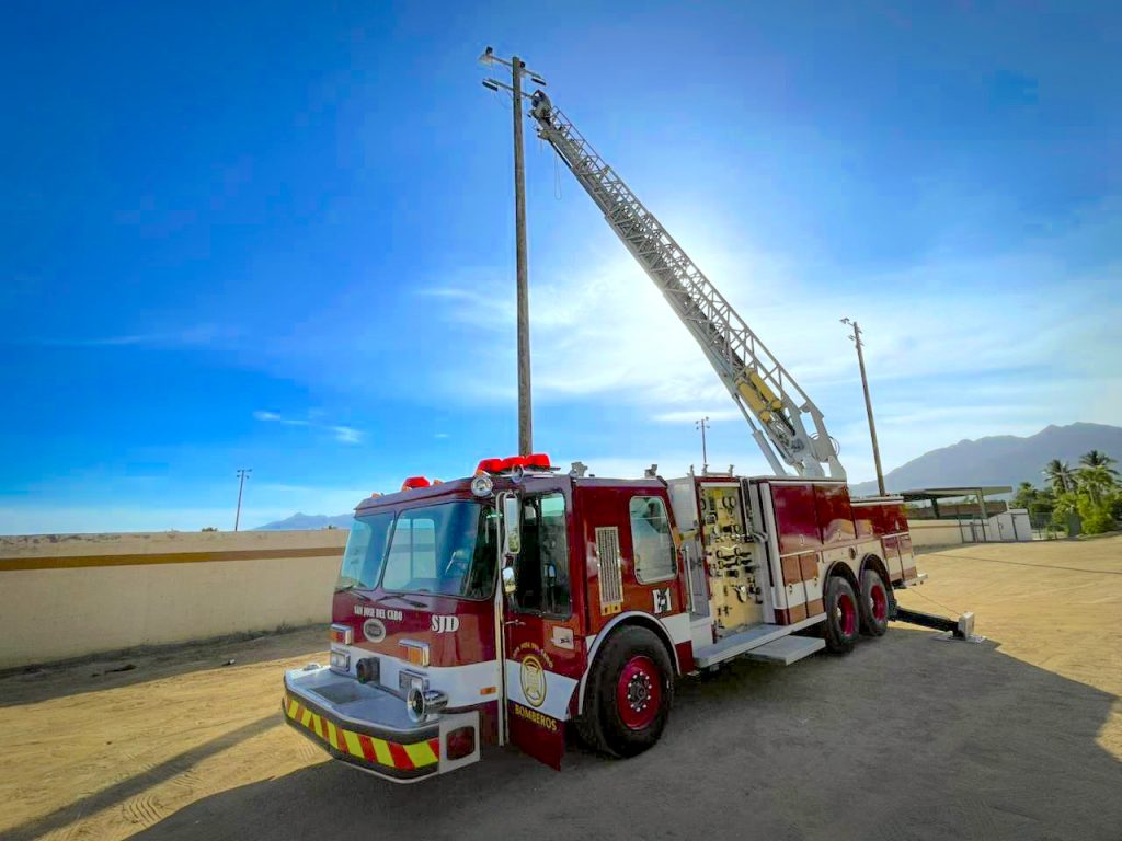 Con el objetivo de fortalecer el trabajo coordinado entre áreas municipales, el Departamento de Bomberos de San José del Cabo puso a disposición el camión escalera ECO-01 para apoyar a la Dirección General de Servicios Públicos y al Instituto del Deporte en la rehabilitación de luminarias en centros deportivos de la zona norte del municipio.