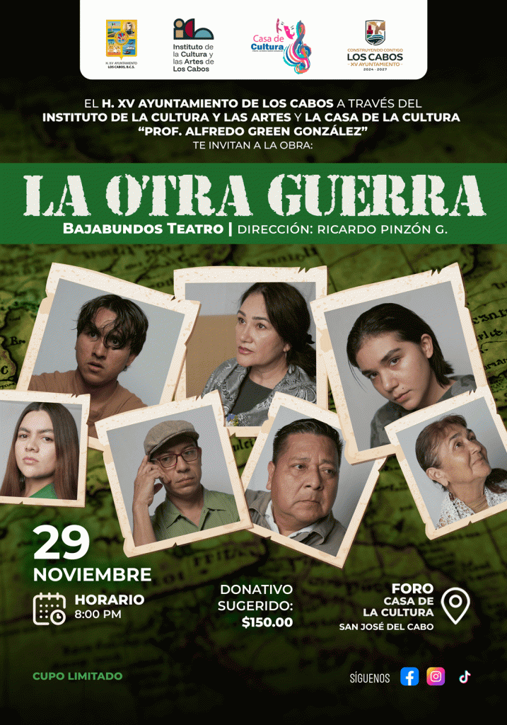 El Ayuntamiento de Los Cabos, a través del Instituto de la Cultura y las Artes, invitó a la comunidad a disfrutar de dos funciones de la obra “La otra guerra”, presentada por la compañía BajaBundos Teatro bajo la dirección de Ricardo Pinzón.