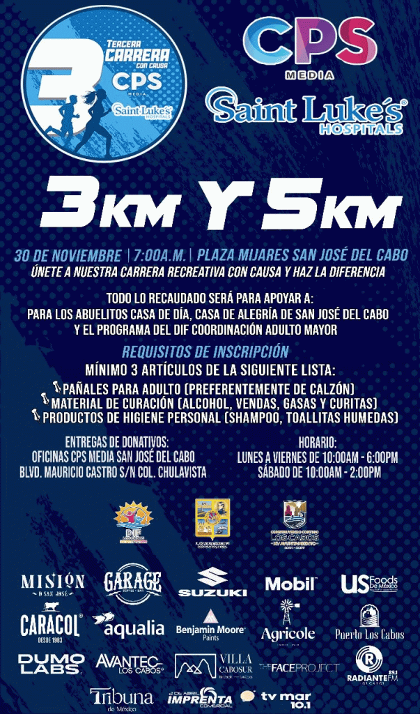 En rueda de prensa se presentaron los detalles de la tercera Carrera Recreativa y Familiar con Causa, organizada por CPS Media y Hospital Saint Luke’s. El evento se realizará el 30 de noviembre a las 07:00 horas en la plaza pública Antonio Mijares, con el objetivo de apoyar a usuarias y usuarios de la Casa de Día – Casa de Alegría del DIF Los Cabos, a través de la Coordinación del Adulto Mayor.