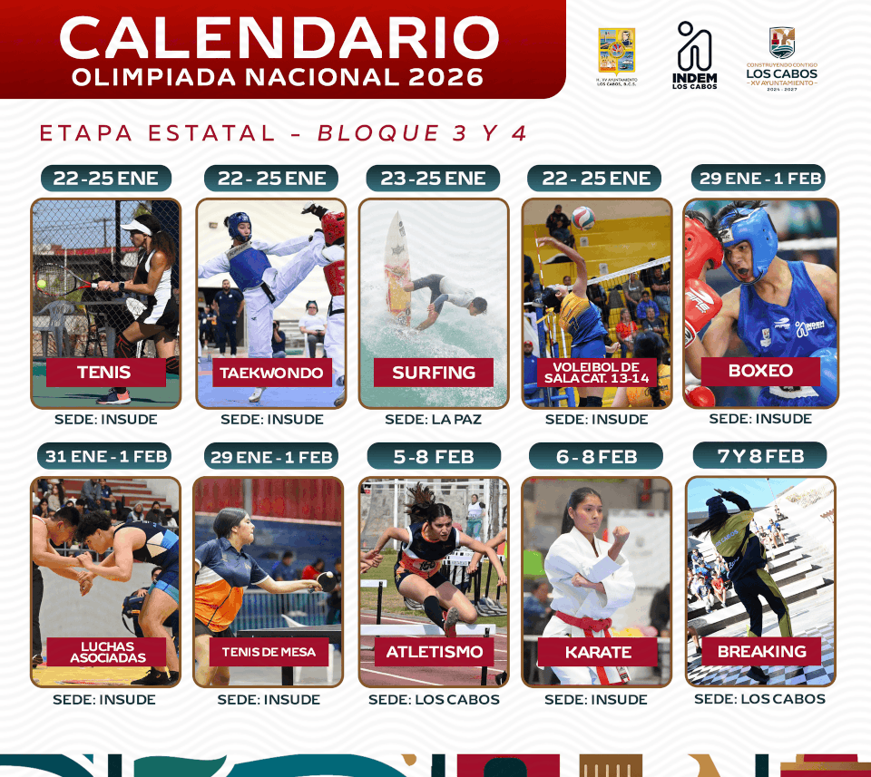 Un punto relevante de esta fase es que Los Cabos fungirá como sede para la disciplina de atletismo, recibiendo a delegaciones de todo el estado del 5 al 8 de febrero. Ante este compromiso, el INDEM iniciará trabajos de mantenimiento y optimización de la infraestructura deportiva local para garantizar instalaciones de primer nivel.